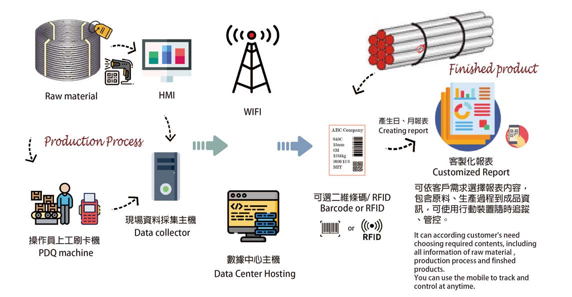 為使客戶提昇生產力及高品質的要求,省權搭配條碼式管理,從材料進廠開始做一料一碼,使系統自動記錄操作員、加工日期、時間、原料來源、原料重量及成品重量等等...,進而得知生產過程中產生多少損耗、花費多少工時,並記錄設備使用電流、耗費多少電力等... ,達到有效管理材料成本,並將生產中所設定的數據自動保存,才能做到生產品質控管。